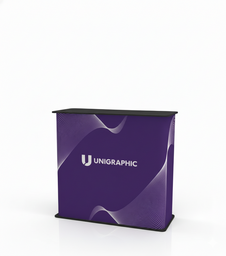 Mostrador Gold Coast para promociones en el punto de venta o stands de ferias promocionales. Este mostrador portátil tiene un montaje sencillo en el que no interviene herramientas. Se puede desmontar totalmente y transportar en la bolsa que incluye. El mostrador Caen tiene 1 estante de plástico en el interior, por lo que los folletos o catálogos se pueden guardar para que la exhibición siempre parezca limpia y organizada. Este soporte publicitario es excelente para ferias y eventos promocionales en tiendas o presentaciones comerciales.
