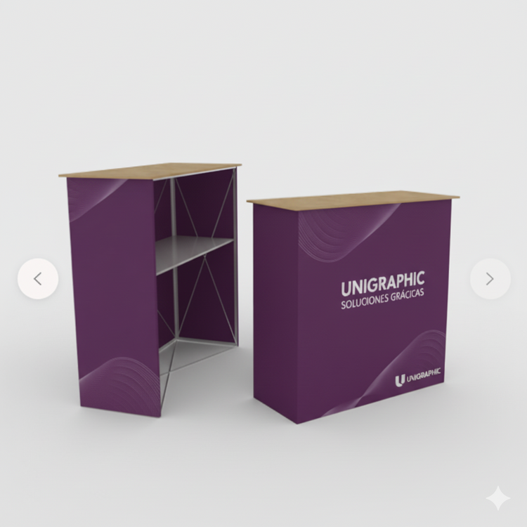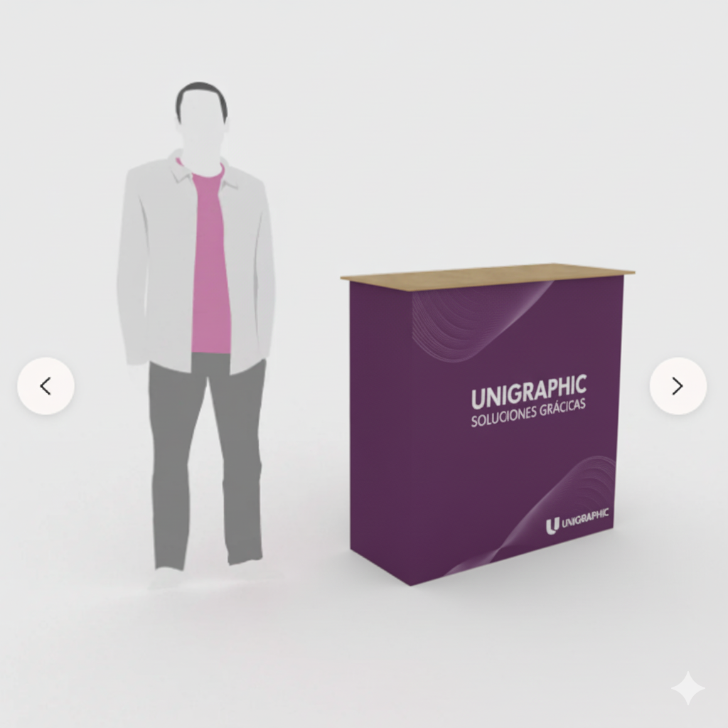 El Mostrador Promocional Textil es un expositor desplegable tipo paraguas con estructura de aluminio y gráfica en textil sublimado 100% poliéster. Fácil de montar y transportar, incluye velcro perimetral para un ajuste perfecto y reemplazo rápido de imágenes. Ignífugo y reciclable, es ideal para ferias, degustaciones, presentaciones y eventos.